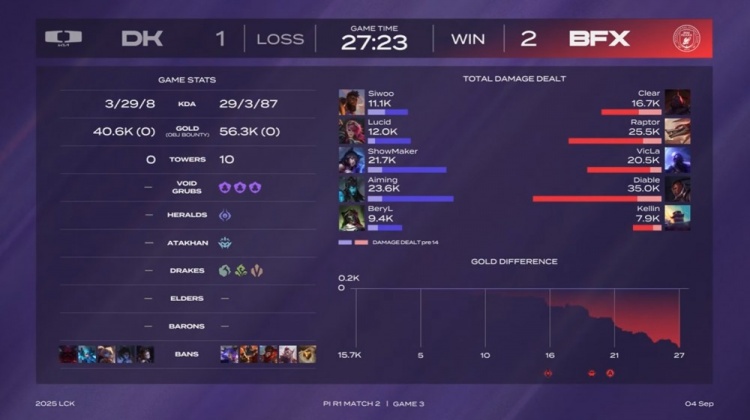 后期野区Clear赛恩与Diable卢锡安连续击杀DK多人,BFX在河道团战中团灭DK,逐渐拉开经济差距。随着Kellin布隆在中路保护队友,Raptor冥犬完成四杀,BFX拆掉两路水晶。最终大龙团BFX再次击退DK,顺势推上高地,一波推平DK基地,拿到赛点。