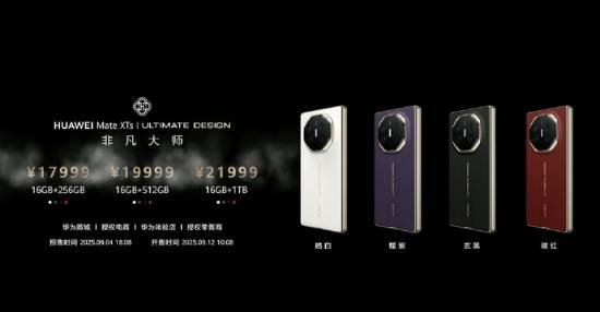 直播吧9月4日讯 今日下午的华为 Mate XTs 非凡大师及全场景新品发布会上,华为发布第二代三折叠手机华为 Mate XTs 非凡大师。16G+256G版17999元起,最贵的16G+1T版为21999元。