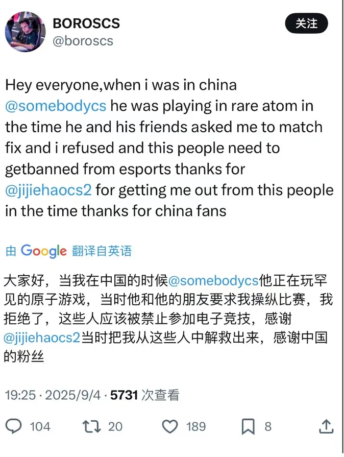 而BOROS本人对此事的回应:Somebody确实试图让我参与假赛,不过我拒绝了。