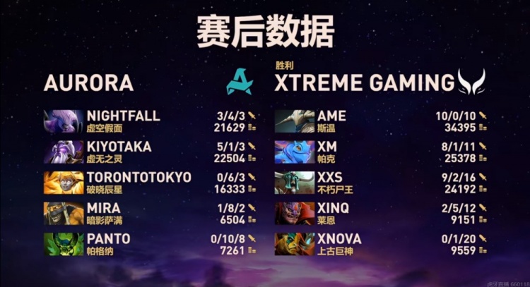 第二局比赛XG打出线优,Nightfall大哥虚空不但没有输出前期还连续几乎空大两波没有帮助队伍打出反扑!虽然Xxs尸王上路一波二连死断了节奏,但是Ame斯温发育成型,Aurora也没输出处理前排的尸王!XG连续带盾推塔+扫图抓单拉开经济差!25级的Ame斯温二代肉山团直接两刀一个出暴击,先后切死Aurora双大哥之后局势已定!高地团XG不断减员Aurora结束比赛,完成复仇的同时拿下瑞士轮首胜!