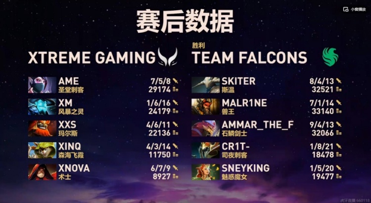首局比赛XG前期顺风顺水,XG节奏不断,连续拿下两代肉山,一度强杀skiter斯温之后拆掉对手两路高地,还有2万的经济优势,但是Ame的TA没出BKB埋下伏笔,Malr1ne兽王吼+ATF滚滚开车带队打回局势,Falcons借助多控阵容连续秒掉XG核心位置,Ame的TA更是连续两次团战几乎啥都没做被秒了!Falcons反推XG两路,最终肉山团获胜之后带盾结束比赛,翻盘成功先拿一分!