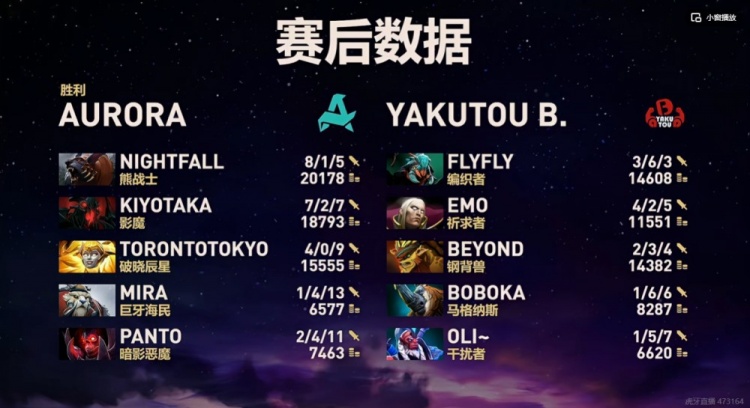 夜魇Aurora:TORONTOTOKYO破晓辰星、kiyotaka影魔、Mira巨牙海民、Nightfall拍拍熊、panto暗影恶魔
