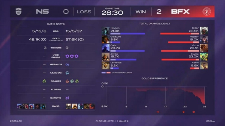 后期GIDEON皇子虽先击杀Raptor赵信和Kellin芮尔,但BFX控制厄塔汗与大龙逐渐扩大领先,最终Diable泽丽与Kellin芮尔进场击溃NS,BFX推平NS基地拿到赛点。