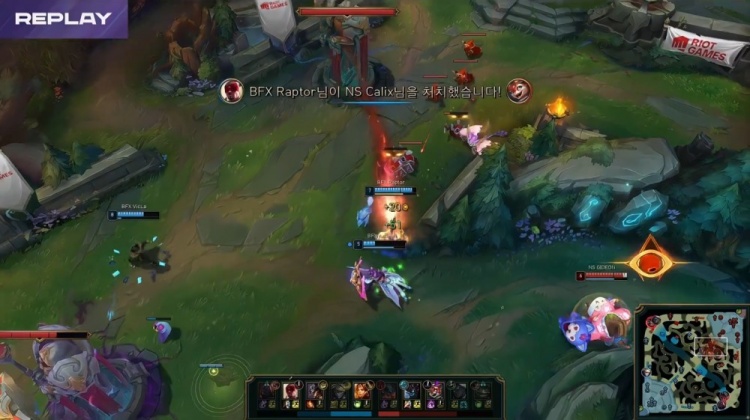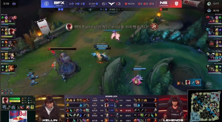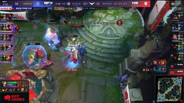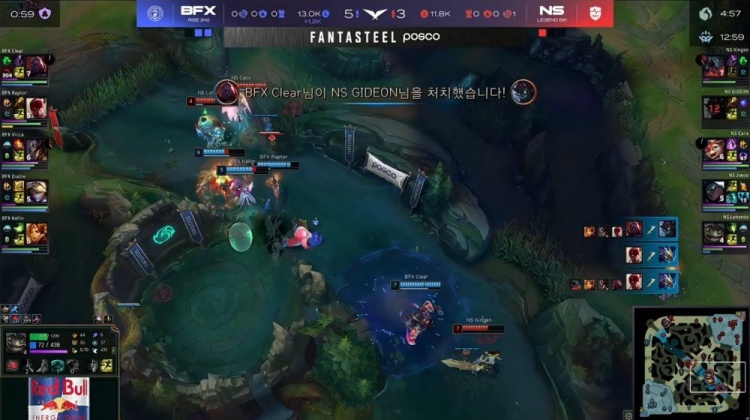 【5:51】BFX三人下路越塔,Kellin与Vicla两人抗塔致死,换掉GIDEON茂凯与Jiwoo塞纳人头,随后Kingen剑魔来下开大砍掉Raptor盲僧大人头。NS打出2换3。小龙团,Raptor盲僧拼惩拿到小龙,BFX经济领先1k。