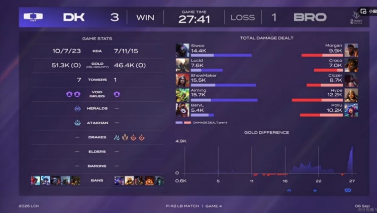 第四局DK给ShowMaker选出招牌乐芙兰,但是他河道被Clozer阿卡丽一打二对位单杀!双方前期团战互有攻守,DK先锋推掉中路双外塔埋下了伏笔!但是21分钟Aiming泽丽单人白给让BRO毫无压力拿下火龙魂听牌!一度给到了DK不小的压力!27分钟关键龙魂团BRO野辅强秒Lucid潘森未果,反而是Siwoo贾克斯找到机会切死了Hype希维尔!DK团灭BRO直接一波结束比赛,淘汰对手的同时,自己明天将和NS争夺最后一个季后赛的名额!而且还是世界赛的门票机会!