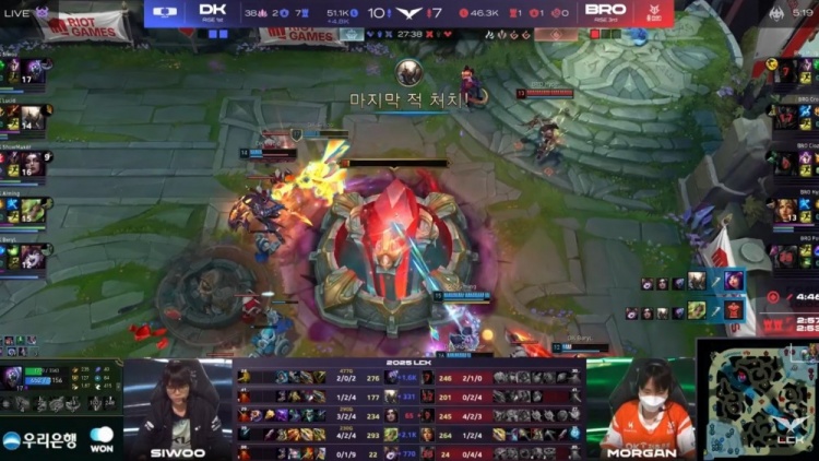 【26:45】龙魂团,Siwoo贾克斯绕后被打掉半血,但是Morgan奎桑提也追深了被SMK乐芙兰打了不少血量,正面Pollu妮蔻闪现大招配合Croco皇子盖大想先秒潘森,但是Siwoo半血贾克斯找到机会直接跳到了后排Hype希维尔脸上将他切死!BRO输出不够了!最终这波团DK打出0换5团灭BRO,直接中路兵线一波结束比赛!淘汰BRO,自己明天将要和NS争夺最后一个季后赛的名额!