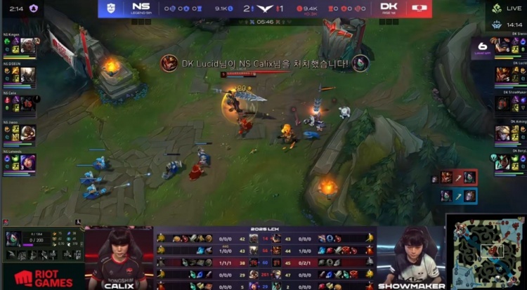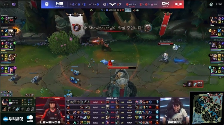 后期Calix阿卡丽多次切掉Aiming伊泽瑞尔,但Kingen安蓓萨与Jiwoo飞机相继被许哥发条终结,DK连控小龙与大龙拉开经济差距。最终Lucid皇子先手控制Lehends妮蔻,DK顺势推进上路水晶后一波推平NS基地先下一城。