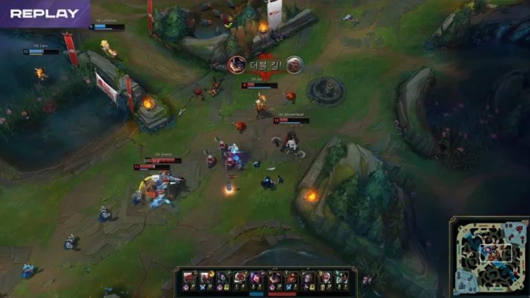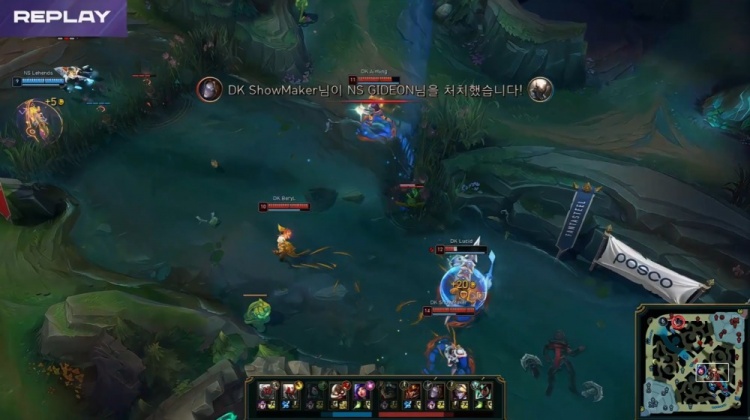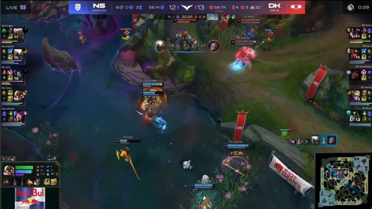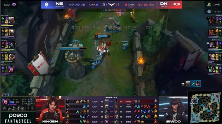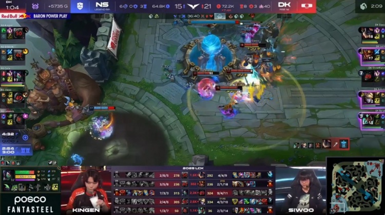 中期GIDEON潘森和Kingen安蓓萨配合越塔击杀Siwoo兰博,并击杀前来探视的BeryL卡尔玛,但NS中路推进,许哥发条大到NS四人吹响反击号角,DK打出1换3扳回局势并凭借小龙扩大优势。