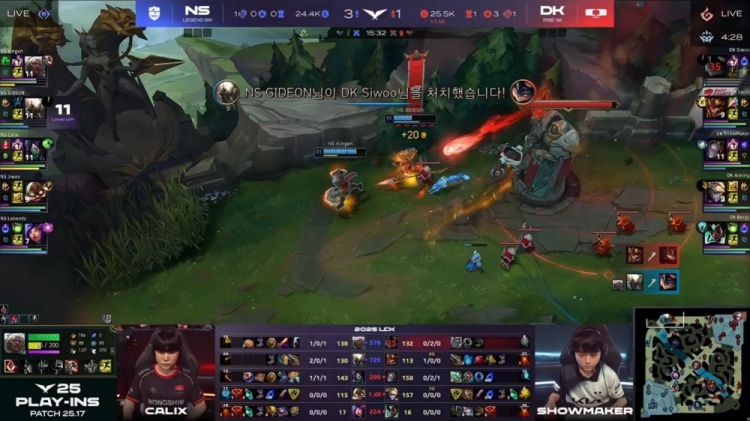 第一局前期,GIDEON潘森中路配合Calix阿卡丽击杀许哥发条拿到一血,随后下路再击杀Siwoo兰博,NS建立小优势。