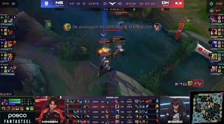【21:43】小龙团,Lehends牛头二连打出Bery洛双召,NS回头吃掉小龙,Lucid盲僧被赶走,DK中路推掉NS二塔与上路二塔,Siwoo反手开大开团,GIDEON赵信三枪挑飞BeryL,Siwoo再杀Jiwoo,DK打出2换3,经济领先7k。