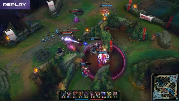 【14:49】GIDEON赵信河道被DK四人包夹,BeryL洛将其抬飞,DK回头吃掉先锋,NS过来接团,Calix安妮控住BeryL,后者交出治疗飞队友逃生,DK拿到先锋撤退,经济领先3k。