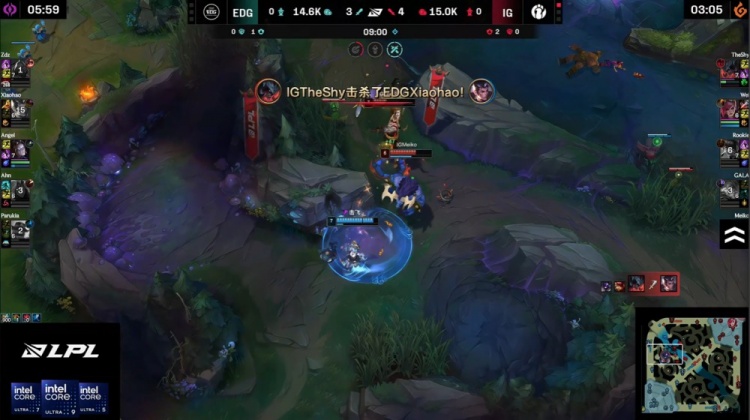 【15:27】先锋团,Rookie安妮被EDG四人逮捕融化,EDG拿到先锋,TheShy剑魔下路开大砍残Zdz,随后推掉EDG下路一塔,iG经济领先3k。