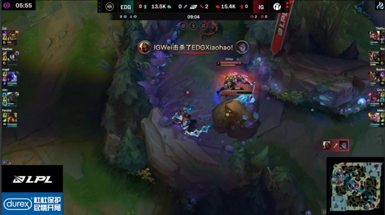 【4:38】Wei劫入侵EDG野区吃掉红buff,Parukia泰坦与xiaohao塞拉斯抓Wei,后者闪现下龙坑配合Meiko洛抬飞xiaohao将其反杀,iG经济领先1k。