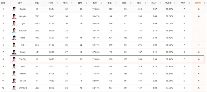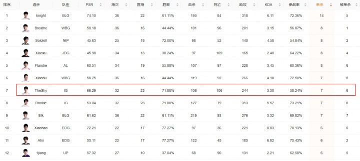 直播吧9月8日讯 近日LPL官方公布了第三赛段的最佳阵容,其中TheShy成为第三赛段的一阵上单,而值得一提的是第三赛段中TheShy一共完成了7次单杀,被单杀了6次!