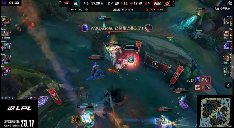 【25:04】AL上路集火强杀Breathe奎桑提之后回头开大龙!Xiaohu瑞兹被kael妮蔻开到,Flandre兰博接上拿下终结赏金!不过WBG输出也打残了AL野辅,逼退了AL打大龙的攻势!