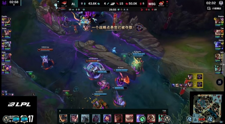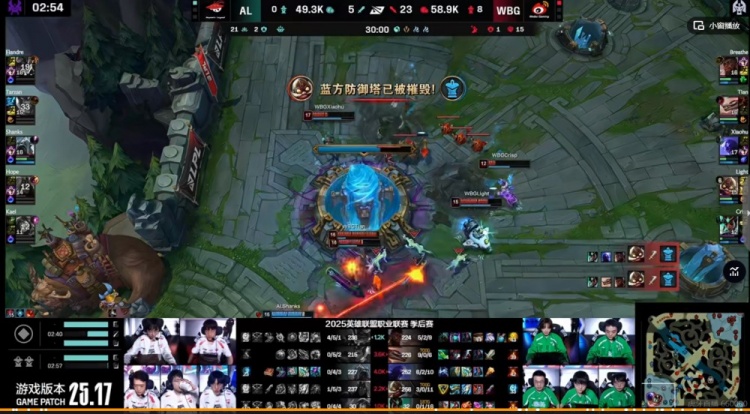 【17:45】第三条小龙刷新,AL上辅大招强开Light库奇但是被他开飞滑开,正面Tian纳亚菲利抢到了小龙!残局团战站在战场上方的Hope维鲁斯落单直接被WBG逮捕!Tian上先锋连人带塔一起撞,WBG再拆AL中一塔!2K经济的优势!