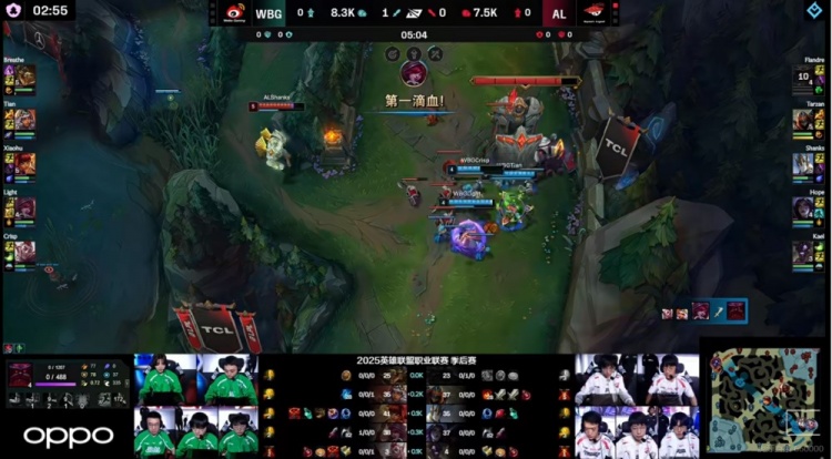 【5:03】WBG三人越下,Light霞倒钩命中配合Crisp洛一个抬,还有Tian琪亚娜补上输出!合力击杀掉了Flandre奥恩!一血给到了Light霞!