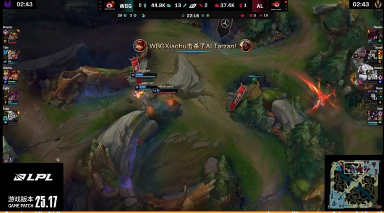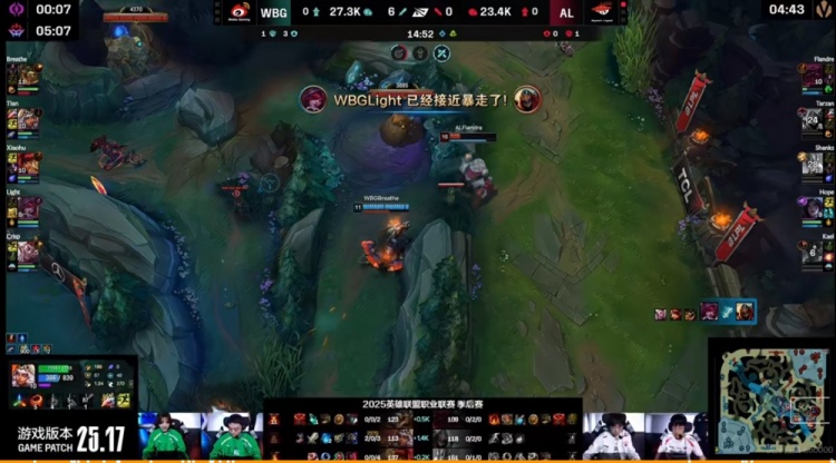 【18:07】AL四人借助kael牛头闪现二连+奥恩大招强开击杀掉了Breathe鳄鱼,但是WBG用先锋拆掉AL中二塔,回头卡视野直接Xiaohu安妮+Crisp洛+Tian琪亚娜三大招直接秒掉了AL野辅!WBG抱团再转上拆掉上二塔!7K多的经济差了!