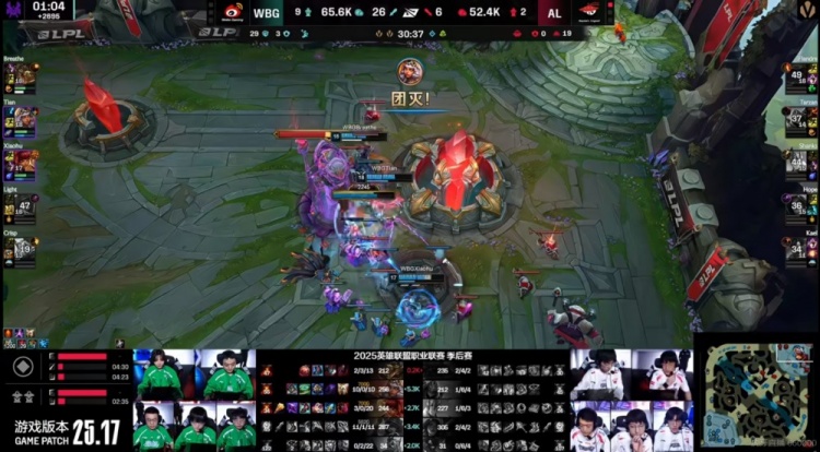 【30:00】WBG分推掉中下两路高地!Crisp洛用大招打断了Flandre奥恩大招但是自己被集火强杀!Hope卡莎虚空索敌命中Light霞直接开飞,但是Breathe鳄鱼一个回马枪开大直接黏住了Hope卡莎!没人管的Tian琪亚娜伤害拉满,最终砍下三杀!WBG团灭AL,扳平了比分!
