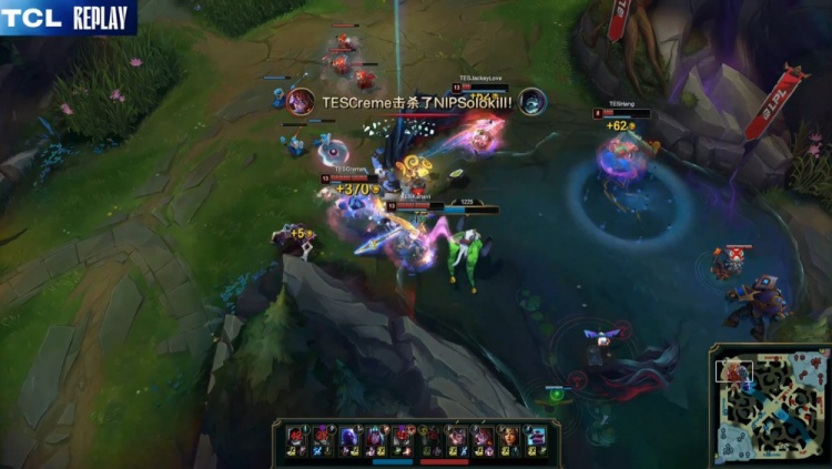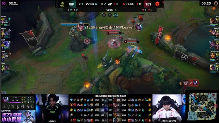 【10:34】Leave中路被Kanavi三枪捅飞,Niket牛头跟着被Creme阿萝拉融化,TES打出0换2,回头吃掉小龙。