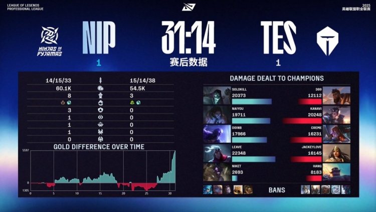后期NIP掏掉大龙,Doinb瑞兹开车与Solokill一起逮捕哥哥。最终naiyou塞拉斯先手拉到Kanavi赵信,NIP依靠Doinb瑞兹和Leave韦鲁斯持续输出完成收割突然杀死比赛,NIP团灭TES后一波推平基地扳回一城。