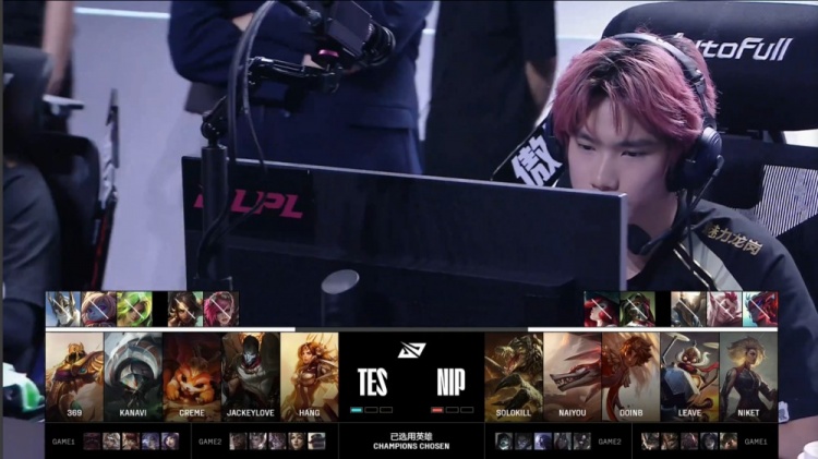 【15:48】先锋团,Kanavi蝎子拉NIP两人,Leave飞机与Niket瞬间被融化,Solokill鳄鱼开大进场瞬间三杀,Creme沙皇戳掉Doinb后被Solokill击杀,naiyou冥犬扑掉Kanavi后阵亡,369纳尔战至最后收掉残血Solokill鳄鱼,TES打出4换5团灭NIP。