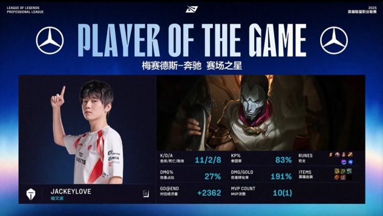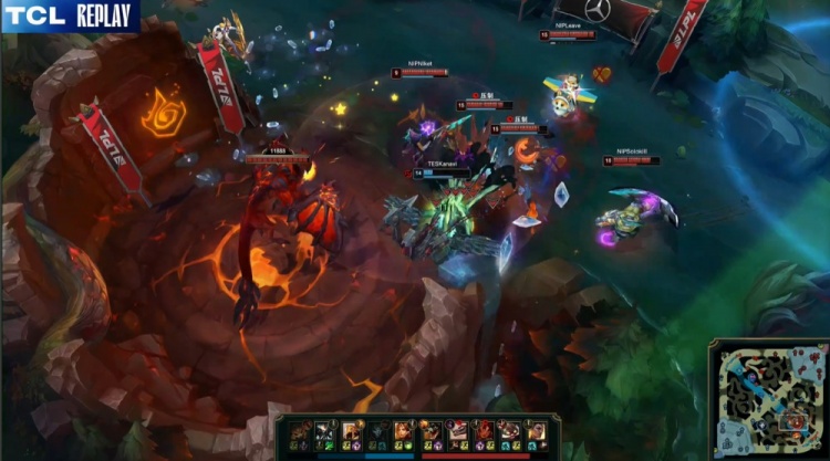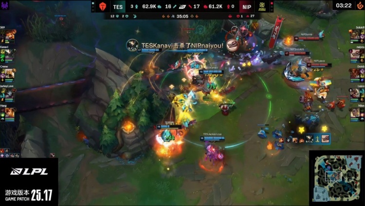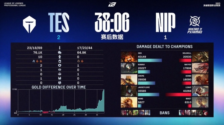 后期小龙团,Kanavi蝎子被Doinb岩雀抬回融化,双方随后围绕大龙拉扯,naiyou锁头进场被Kanavi蝎子隔空钳住击杀,TES吃掉大龙。最终TES下路推进,NIP正面毫无一战之力,哥哥烬四杀收尾,TES一波推平NIP基地先拿赛点。