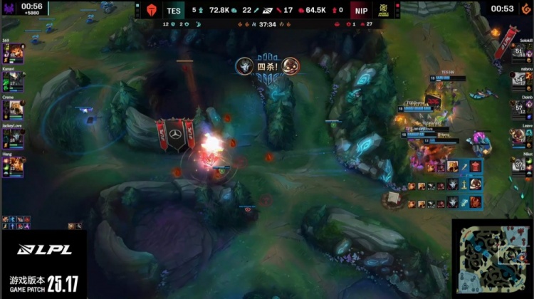 【37:37】TES下路推进,NIP瞬间被融化,哥哥烬四杀收尾,TES打出0换5团灭NIP,一波推平NIP基地拿到赛点。