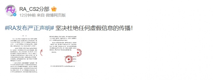 刚刚Somebody曾经效力的RA战队发布声明公告表示:从未组织、指使或纵容选手参与任何形式的假赛、使用外挂等违规行为。坚决杜绝任何虚假信息的传播!