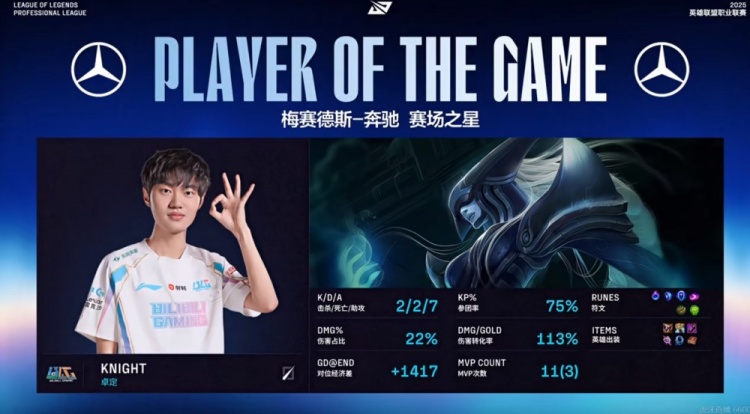 第一局:🎮左手标记你!knight兔子单杀Rookie瑞兹+无限超神 BLG赢首局