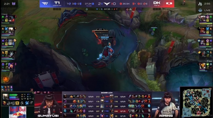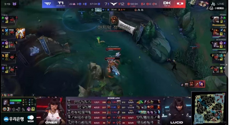 【23:51】Gumayusi烬河道落单直接被BeryL巴德大招定住,Lucid皇子跟上框大将他拿下!随后DK拆掉T1中一塔之后还越塔强杀掉了Keria妮蔻,但是Aiming伊泽瑞尔又吃了T1中野控制白给了!DK的1换2!随后T1也换掉了DK中一塔!