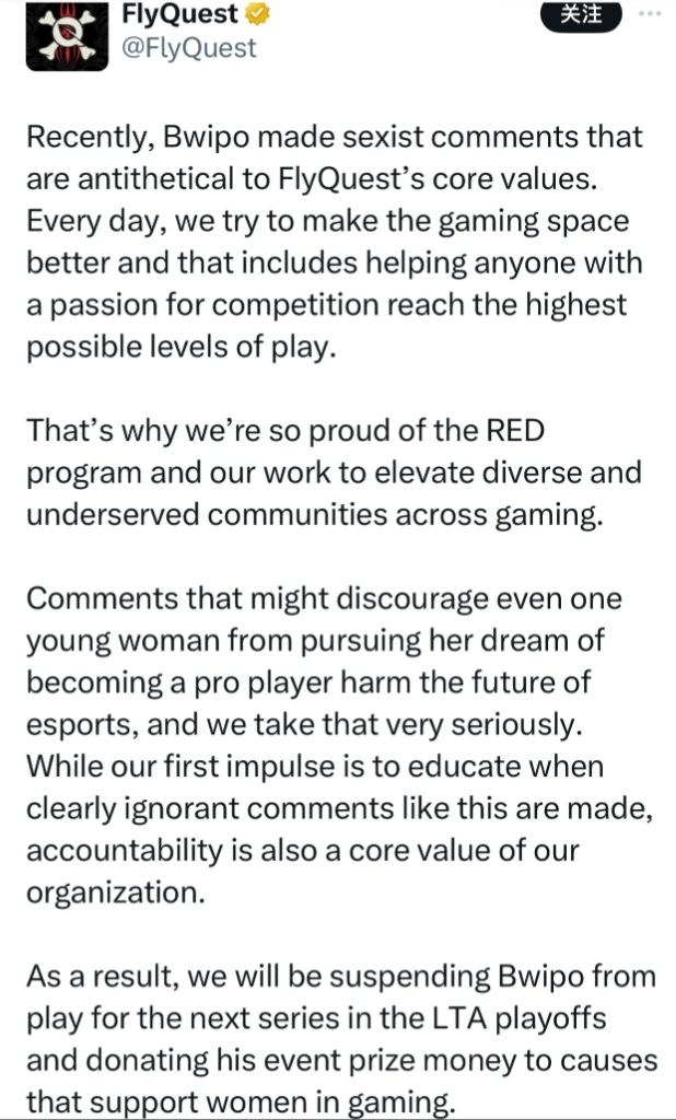 对此FLY官方发布声明,Bwipo言论性别歧视违背了FLY的核心价值,将对做出Bwipo禁赛一轮BO5的处理,并将他的奖金捐给支持女性电竞游戏事业机构。