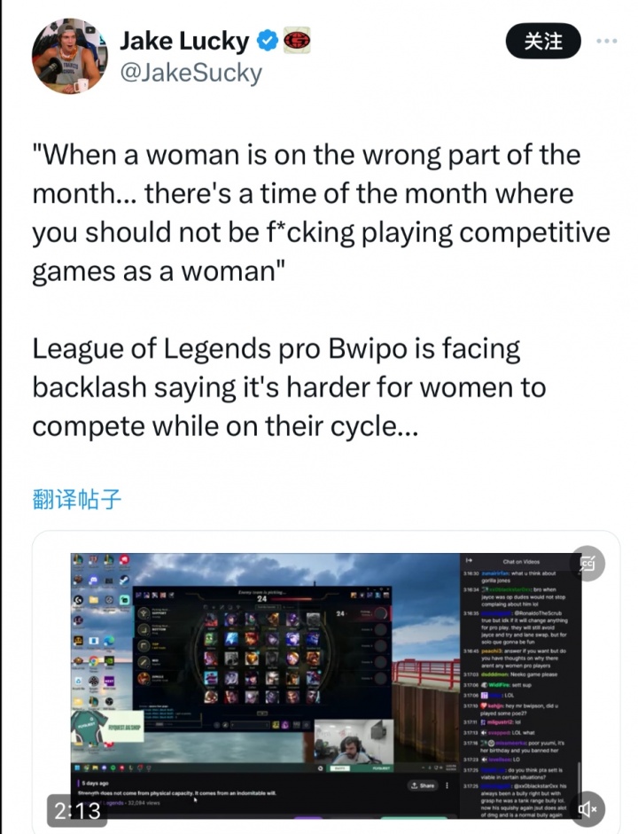 直播吧9月10日讯 近日美洲FLY战队上单,多次参加国际赛的Bwipo在直播中的言论在推上引起渲染大波,Bwipo表示女性每个月都有月经期,在月经期内就不应该玩竞技游戏。