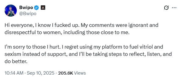 对于被我伤害的人,我感到非常抱歉。我后悔利用自己的平台煽动恶意言论和性别歧视,而不是提供支持。我会认真反思、倾听意见,努力改正。”