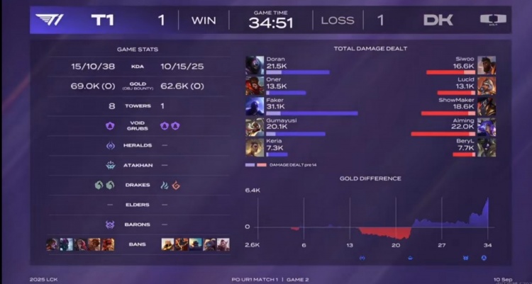 第二局Doran选出上单贾克斯开局就被Siwoo奎桑提单杀送出一血!但是Lucid琪亚娜毫无熟练度,下路越塔送给Oner猴子双杀!关键团来到厄塔汗交锋,BeryL牛头绕后顶回库奇但是DK没人跟控制,结果是Siwoo奎桑提一起进场没了!T1追击击杀DK四人拿下厄塔汗+下路双外塔,一波打回5K经济差!随后比赛Doran贾克斯单防SMK卡牌帮助T1拿下大龙,上路团战Aiming芸阿娜奇怪位置离谱白给,T1再留牛头打出0换2,一波扳平了比分!