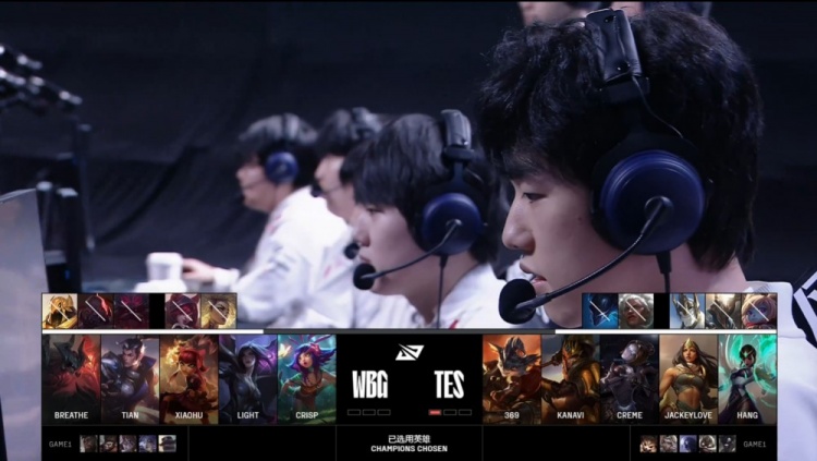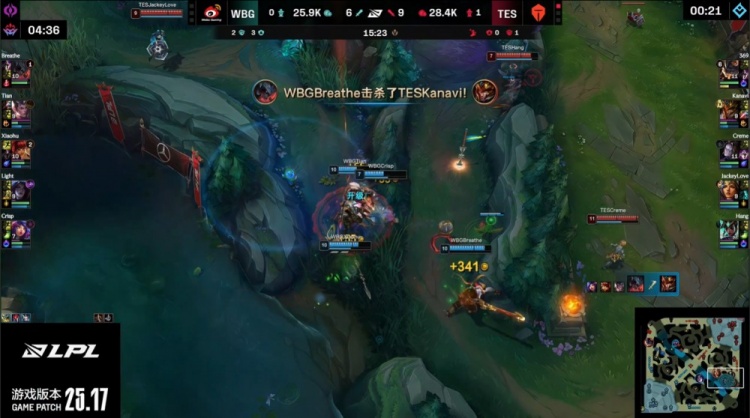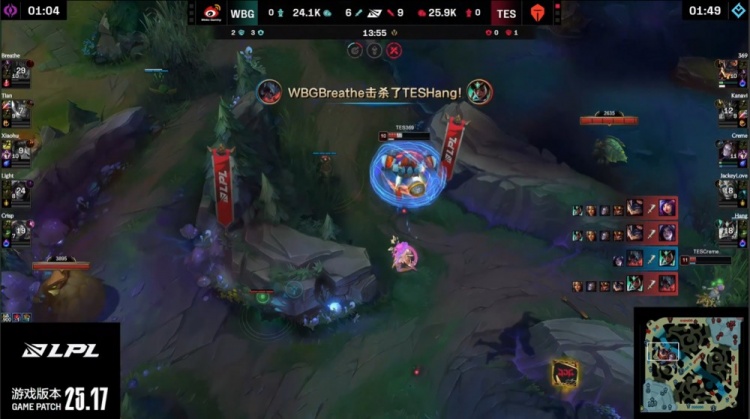 【22:39】Breathe剑魔下路推线被逮捕,上路xiaohu推掉TES一塔,随后野区团战,小天赵信开大1v4被杀,TES推掉WBG中路二塔,经济领先3k。
