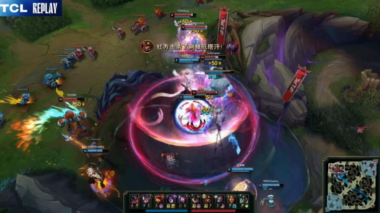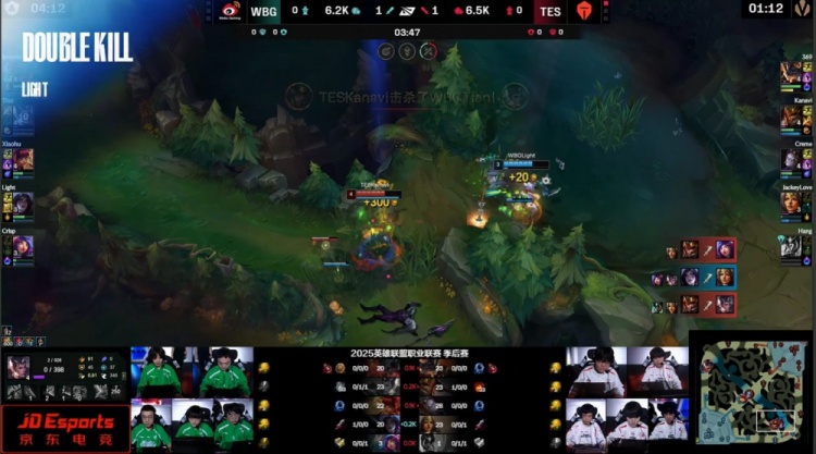 【13:28】先锋团,Kanavi皇子火锅盖两人击杀xiaohu安妮,Creme发条带走小天赵信,Breathe剑魔砍掉Kanavi,野区混战,Light卡莎终结哥哥,但369兰博到场烧烤双杀,TES打出2换5团灭WBG,经济领先2k。