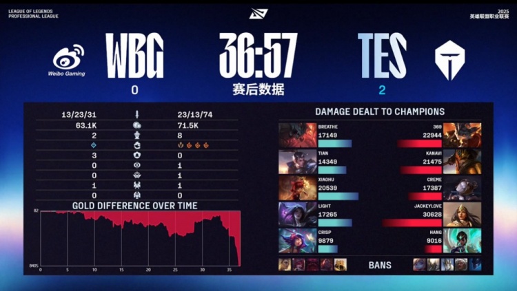 后期TES抓死Breathe剑魔并推掉WBG中路二塔。龙魂团,xiaohu安妮闪现空W,刘神妮蔻开团被融化,小天赵信也捅进人群被杀,TES拿到火龙魂后再吃大龙。最终TES上路一波推平WBG基地拿到赛点。