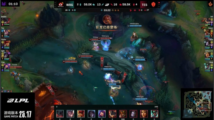 【27:01】hang卡尔玛野区被抓,Light卡莎飞脸吃掉人头,河道团战,刘神妮蔻开TES两人,小天被Kanavi火锅盖住,Light再杀kanavi,哥哥希维尔开大双杀后被小天捅飞,双方打出2换2,随后WBG轻松吃掉大龙,经济落后1.5k。TES拿到小龙,听牌火龙魂。