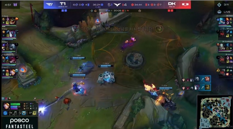 【6:25】Siwoo格温上路抢6直接大招磨血打残Doran鳄鱼,随后Lucid翠神赶到一个闪现Q补上了控制!两人合力越塔强杀鳄鱼!一血给到了Siwoo格温!T1只能换掉小龙!