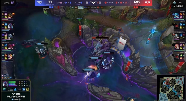 【25:51】T1抱团开大龙,BeryL波比锤飞Faker维克托自己没了!随后Keria机器人一钩还带回了Lucid翠神!T1打出0换2,再拿大龙!随后野区又抓死BeryL波比,拆掉DK上路二塔!6K经济差!