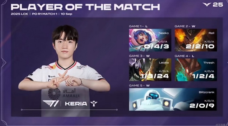 直播吧9月10日讯 2025年LCK正式进入季后赛阶段!今天是首场的季后赛对局,T1对阵DK!