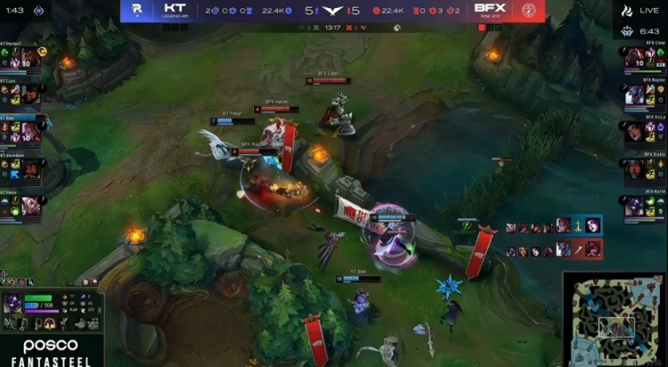 【3:07】下路交战,Raptor巨魔先到,但是BFX有点贪了!结果是KT帮助Deokdam霞反杀掉了巨魔拿下一血!