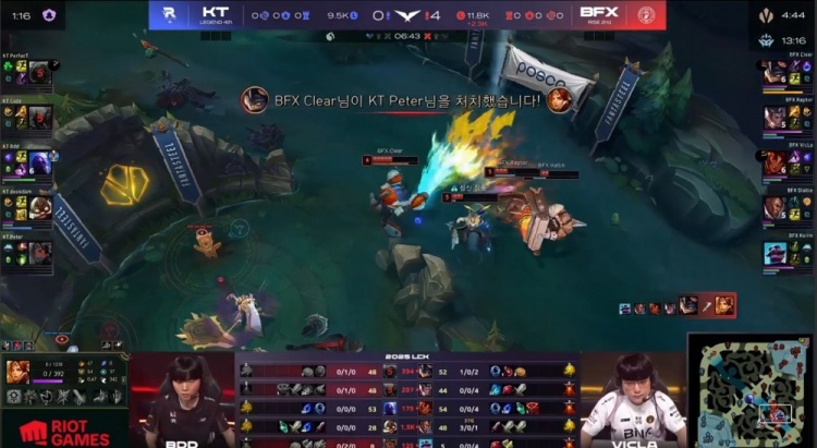 【16:15】Raptor赵信下路放出先锋,与Vicla一起推掉KT一塔,随后Raptor开车去中,BFX经济领先4k。