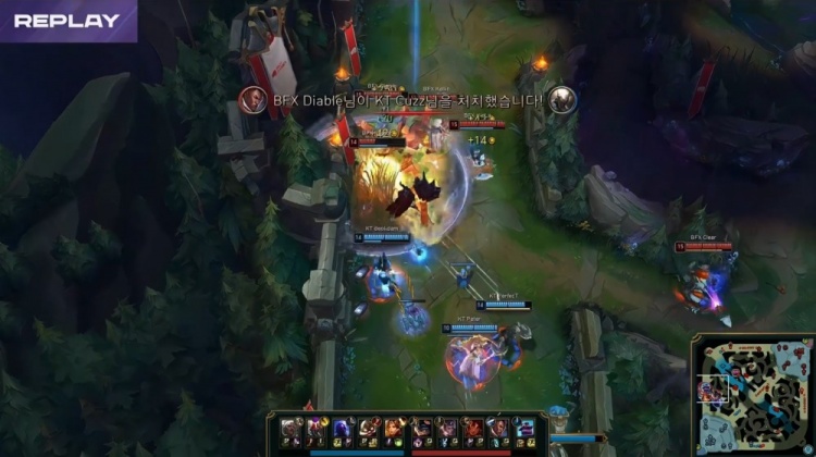 【14:11】KT三人中路越塔想杀Diable未能得手,KT野射两人均被击杀,BFX打出0换2,Vicala岩雀双杀。BFX经济领先4k,Raptor拿到先锋。
