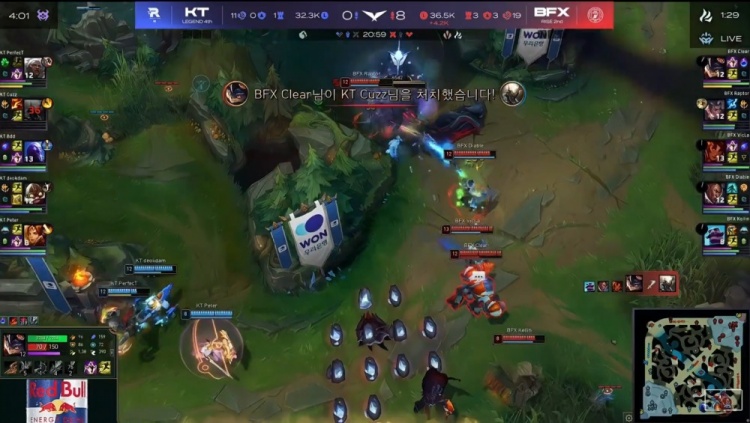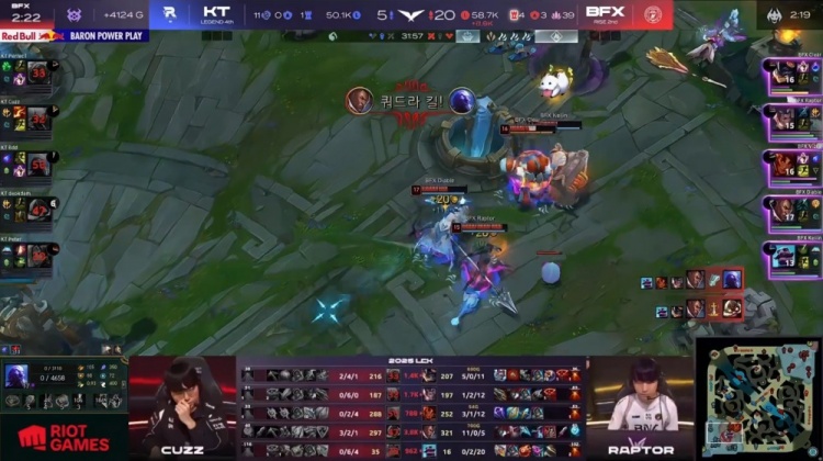 【29:28】BFX上路推进逮捕Cuzz,回头大龙逼团,KT四人尝试接团被Diable卢锡安圣枪洗礼逼退,Clear兰博大招洒下,deokdam飞机导弹反手双杀,双方拉开。