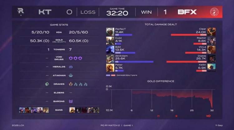 后期Bdd瑞兹带队尝试开大龙未果,Clear兰博与Diable卢锡安在上路和大龙处连续击杀Cuzz潘森与PerfecT安蓓萨,BFX顺势吃掉大龙中路推进,Diable卢锡安爆轰四杀,BFX打出0换5团灭KT,一波推平KT基地先下一城。