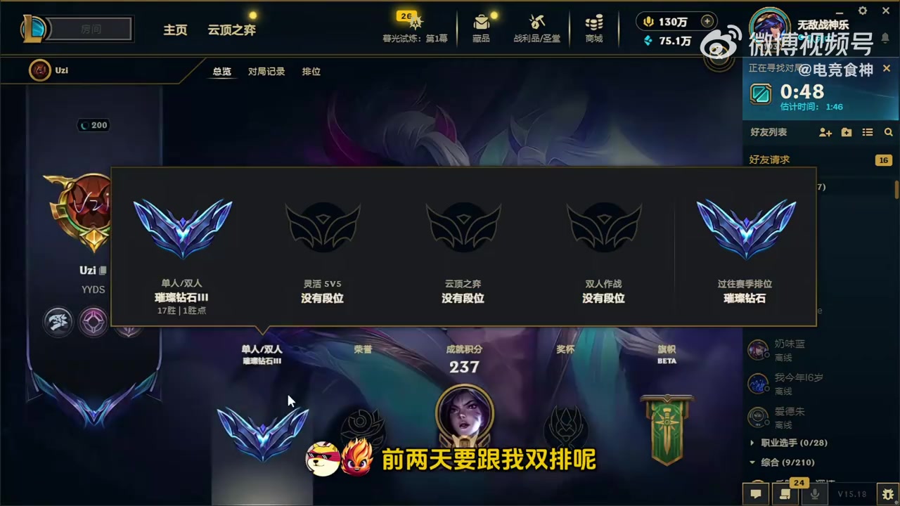 乌兹也在打峡谷,前两天要跟我双排呢,但是他那个翡翠我跟他排不了,他打那个翡翠打钻石肯定战绩好啊,我在翡翠的时候我就已经开始排大师宗师了。