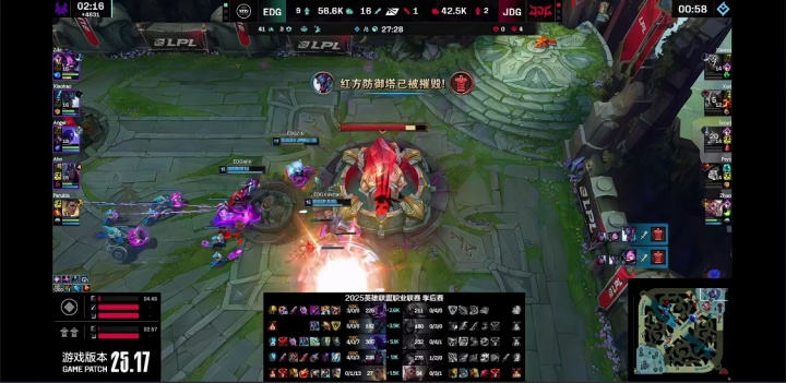 直播吧9月11日讯 LPL第三赛段季后赛败者组EDG击败JDG拿到赛点,EDG本局打出16-1的人头比,JDG唯一一个人头是Peyz取得的击杀。