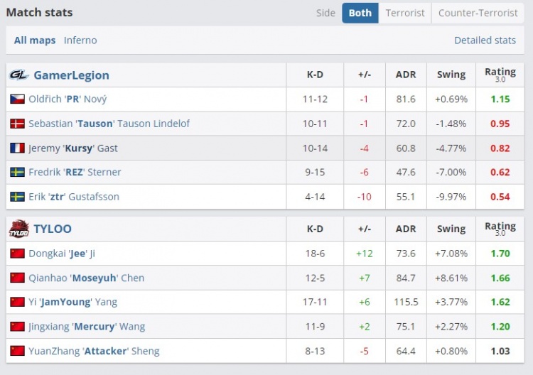 图一是TYLOO选择的Inferno!开局Jee手枪局GLOCK四杀+赢下1v1残局带队拿到5-0,随后Moseyuh在三箱顶级定位1v2赢下残局,TYLOO进攻方半场砍下9分建立优势。下半场手枪局Mercury只有5滴血但是usp双杀帮助TYLOO赢下手枪局,随后JamYoung香蕉道AK顶级扫转四杀刷屏!TYLOO无论是枪法还是战术都完美压制了对手!最终以13-3的比分轻松先下一城!